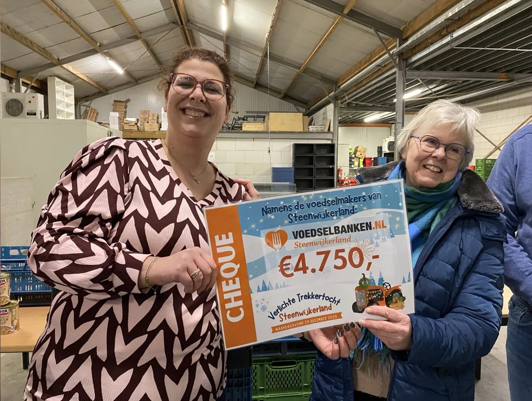 De inzamelingsactie van de Verlichte Trekker Tocht 2025 heeft het mooie bedrag van € 4.750 opgebracht. Mede-organisator Savannah de Vries van LTO Steenwijkerland reikte woensdagavond 28 januari een cheque uit aan Ilsemary Bruins, secretaris van Voedselbank Steenwijkerland. Dat deed zij in het gebouw van de Voedselbank in Steenwijk. “Hier gaan we verse groente, fruit en vlees van kopen.”